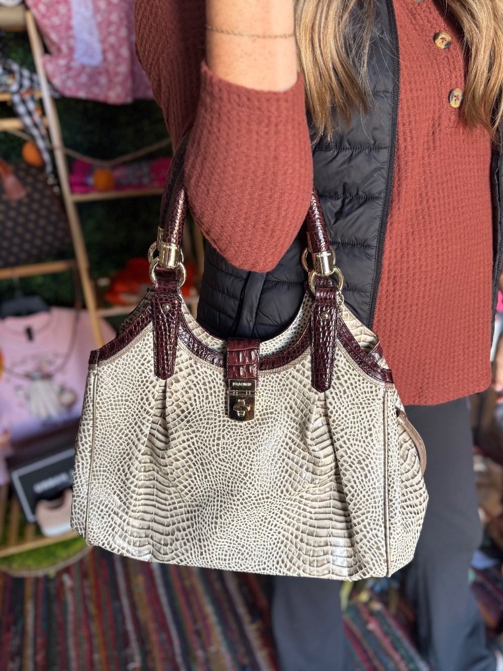 This Brahmin bag is big! Two huge sections separated by a small zippered compartment. There is a pair of top handles and a crossbody strap.