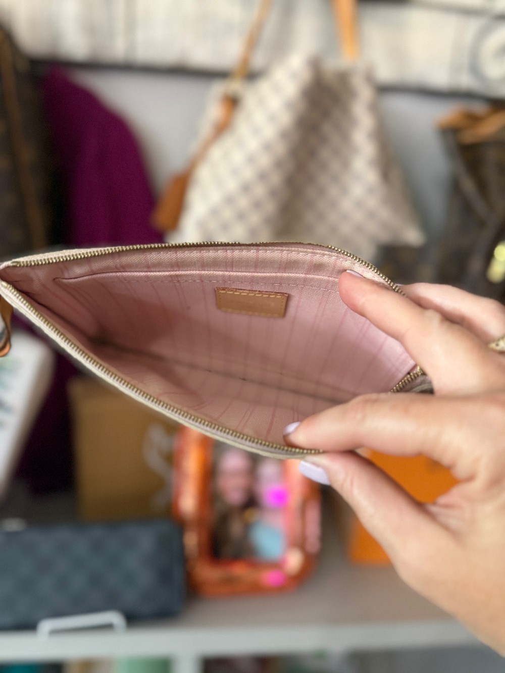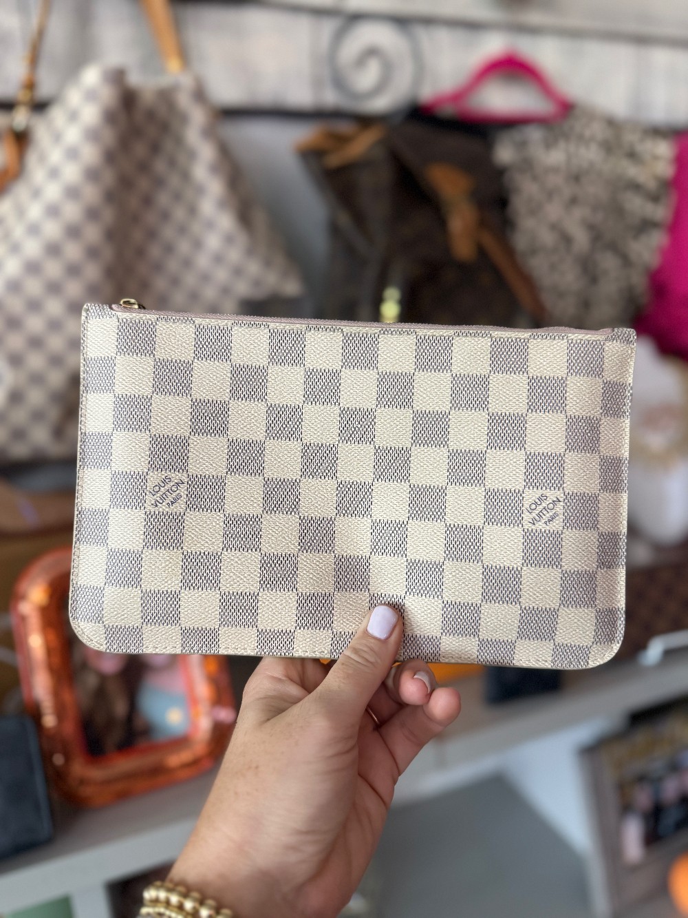Louis Vuitton Pochette—timeless and versatile in iconic Damier Azur canvas. Perfect as a chic clutch or everyday essentials pouch, featuring a sleek silhouette, durable coated canvas, and signature LV style.