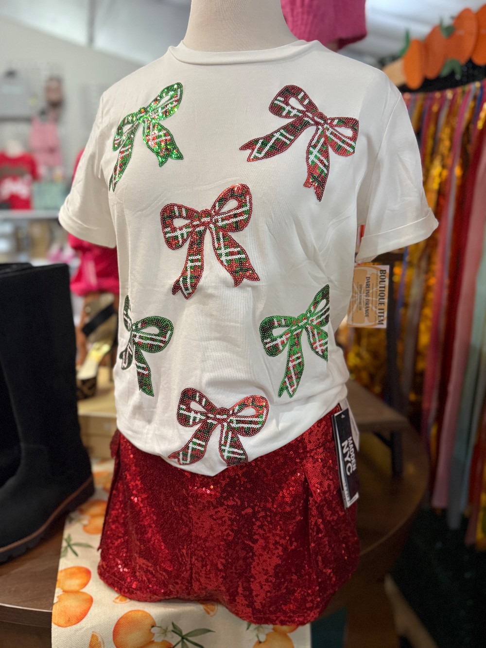 This precious bow tee is the perfect top for your holiday season activities. Pair with a red or green cardigan if it's cold!